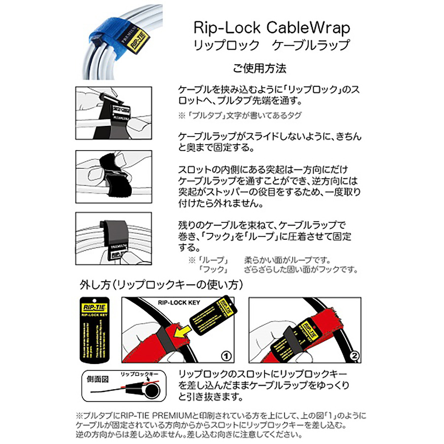 ケーブルへの取り付け方は、プルタブを後端のスロット穴に通すだけ。スロット内部の特殊な「歯」がストラップをしっかり固定し、ケーブルから外れてしまう心配がありません。取り外しの際は、付属のリップロックキーを差し込みながらストラップを引き抜きます。