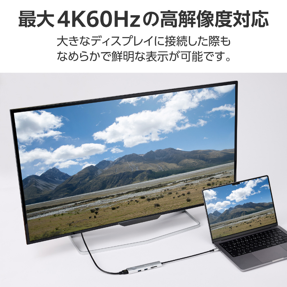 HDMIポートは最大4K60Hzの高解像度に対応。大きなディスプレイに接続した際もなめらかで鮮明な表示が可能です。