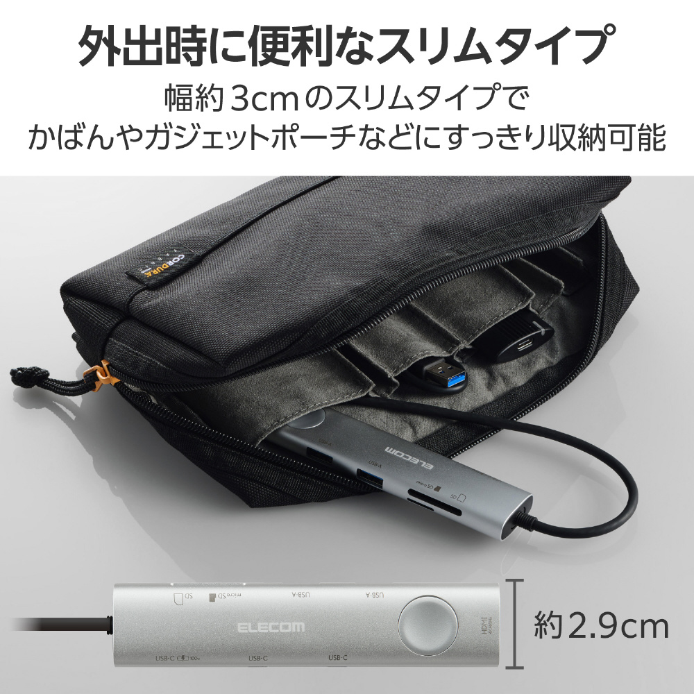 幅約3cmのスリムタイプ。かばんやガジェットポーチなどにすっきり収納でき、外出時の利用に便利です。