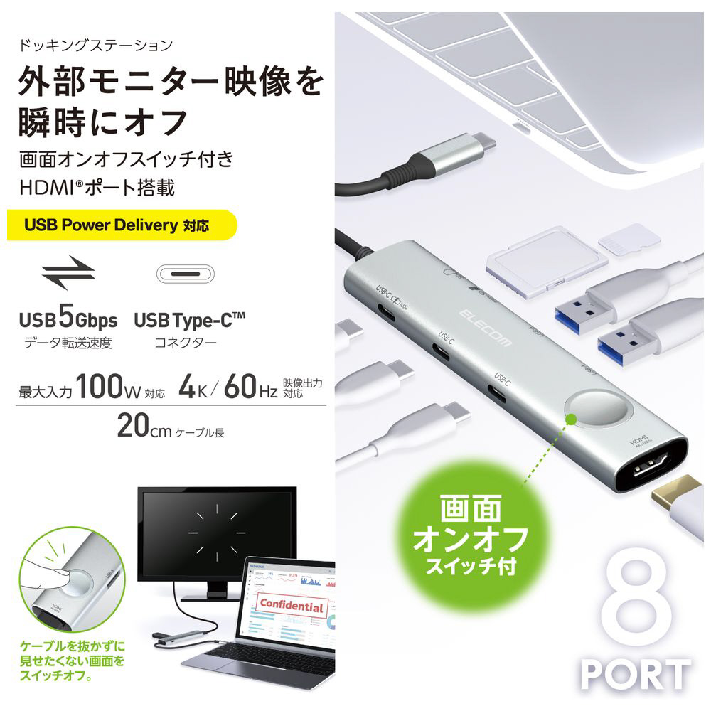 HDMI(R)・USB-A・USB Type-C(TM)ポートなどを搭載し、さまざまな機能を拡張できる8in1タイプのドッキングステーションです。通常の出力ポートに加え、外部ディスプレイのON/OFFを瞬時に切り替えられるスイッチ付き。ビジネスシーンで見られたくない画面を一時的に隠せる、便利な機能を搭載しています。