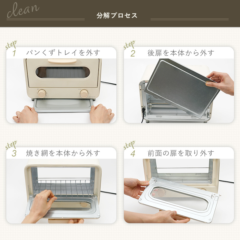 前後扉が分解できて簡単お掃除!いつでも清潔にお使いいただけます。