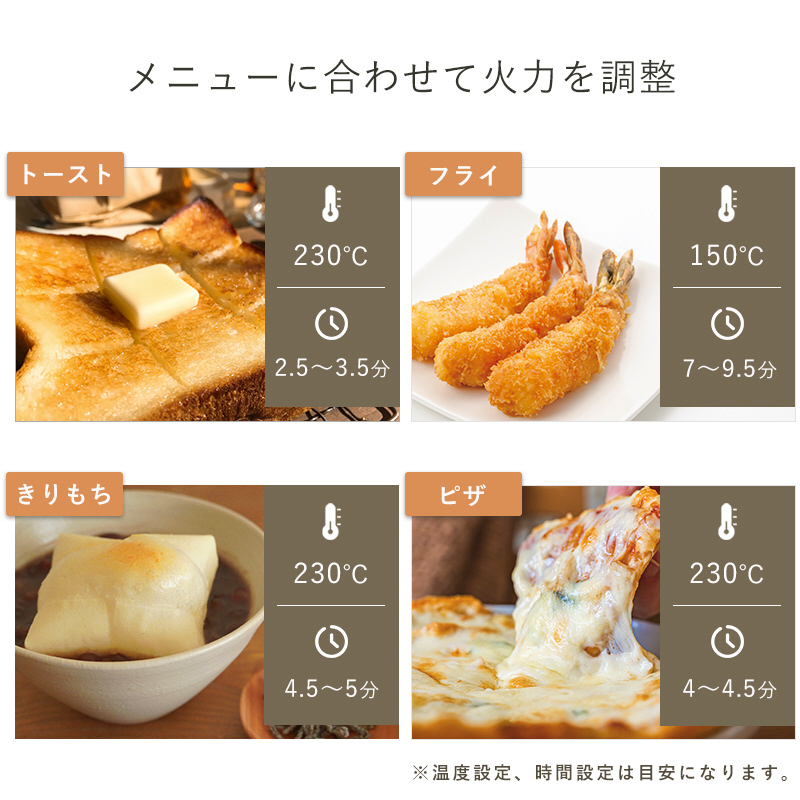 最大230℃・タイマー30分の様々なメニューに対応します。