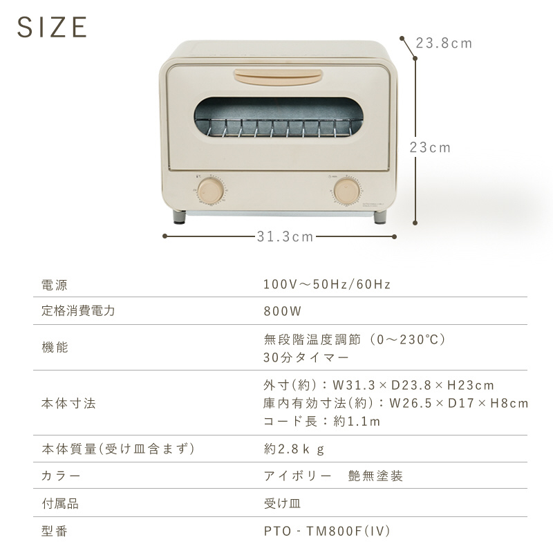 カーボンヒーター搭載 お手入れ簡単分解2枚焼きトースター アイボリー PTO-TM800F(IV)