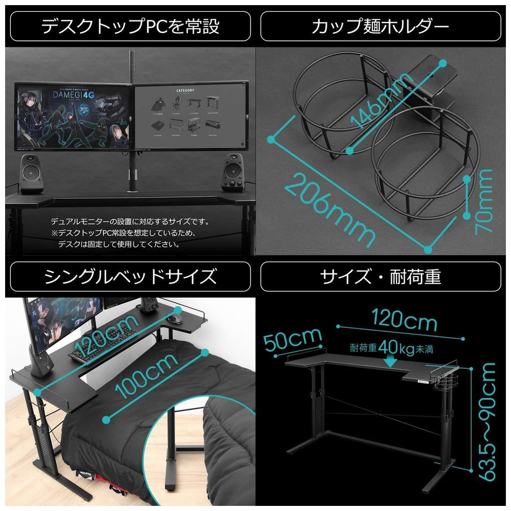 ※天板の奥側に荷重が偏ると、後方へデスクが転倒する可能性があります。ベッドと壁の間に挟むようにして、壁際にデスクを設置することを推奨します。