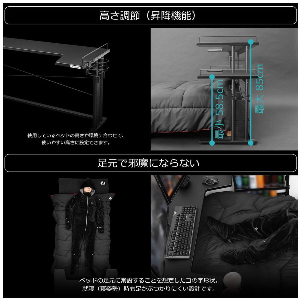 ベッドの足元にPCモニターを設置できるゲーミングデスクです。