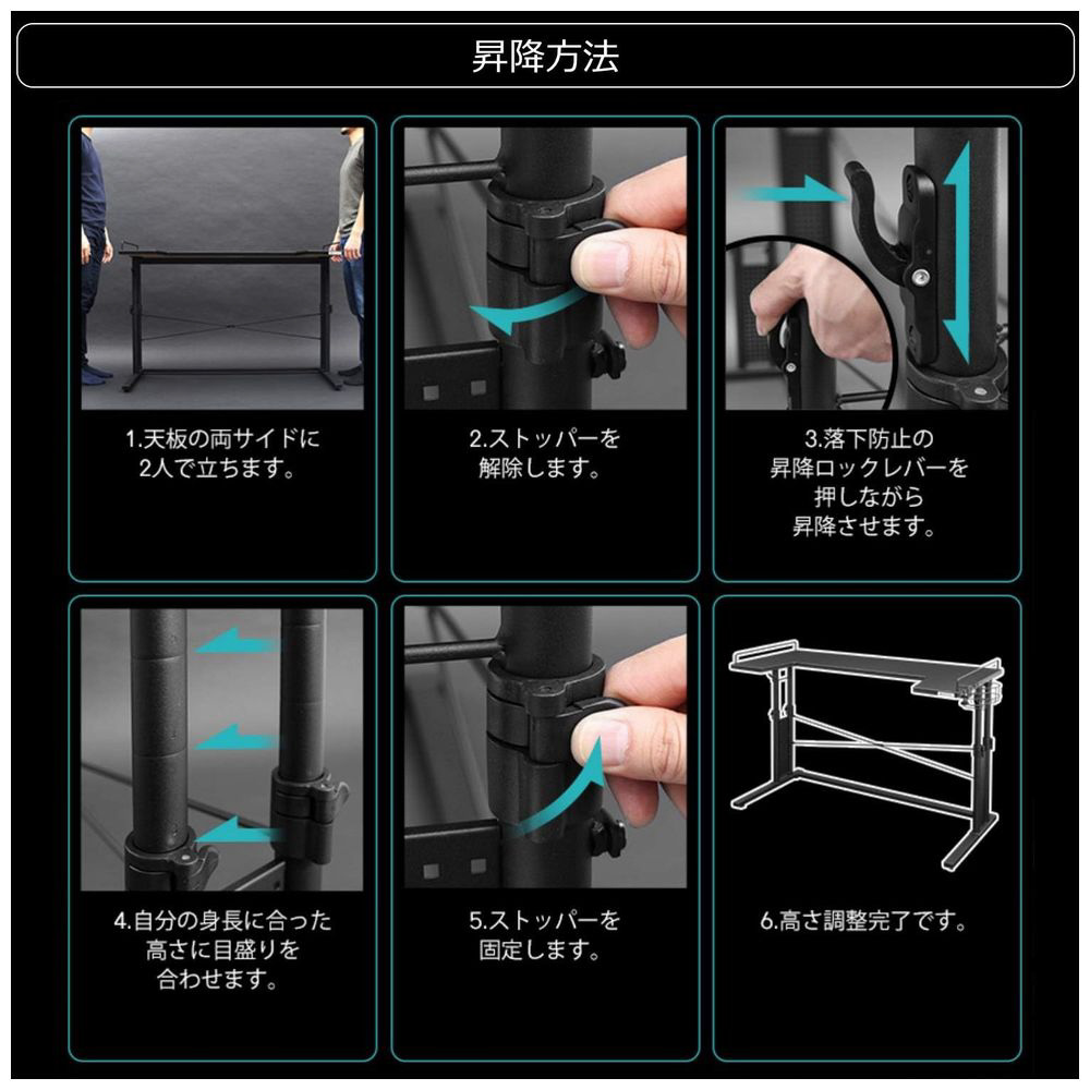 ストッパーと昇降ロックレバーの操作で天板の高さを調節できます。