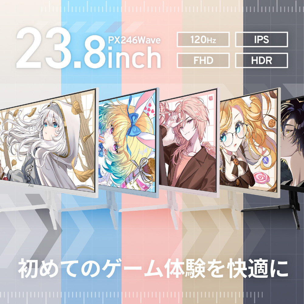 初めてのゲーム体験を快適に PX246WAVEは、理想のゲーム部屋のコーディネートができるカラーが特徴のゲーミング24インチモニターです。 同じカラーのモニターアームもシングル(PS1S Wave)とデュアル(PS1D Wave)をそろえていて、より統一感を持たせられます。 120Hzのリフレッシュレートのためゲームではコンシューマーゲーム機に最適で、仕事用としても活躍します。