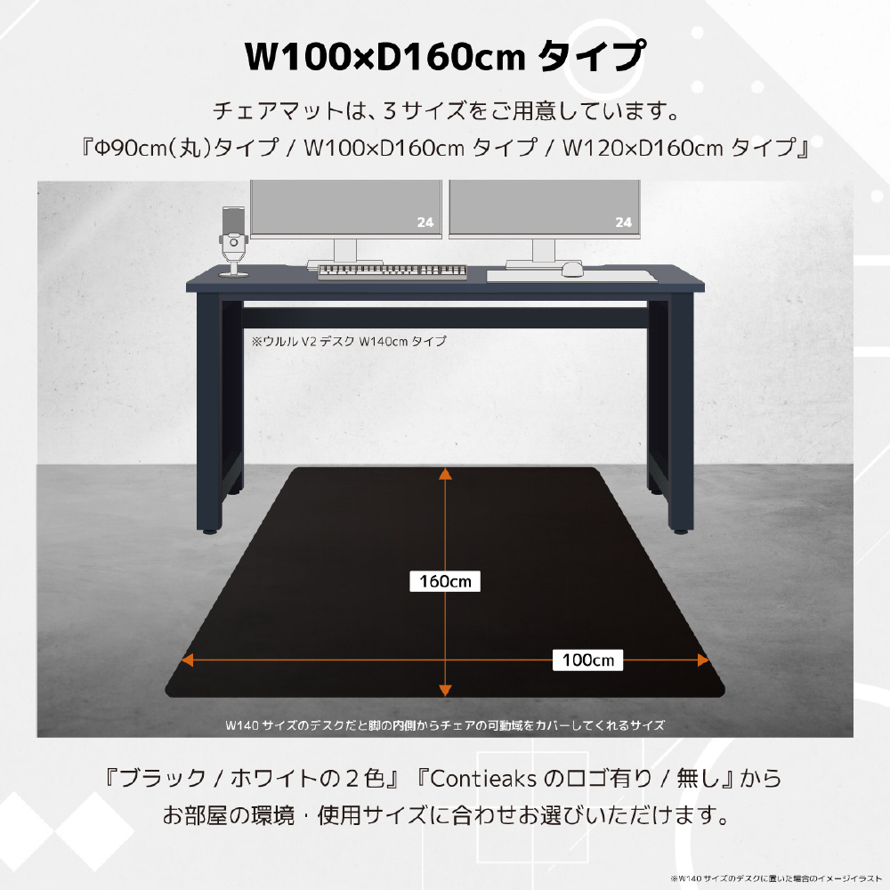 デスク内側の床からチェア可動域までフルカバーできるサイズ。