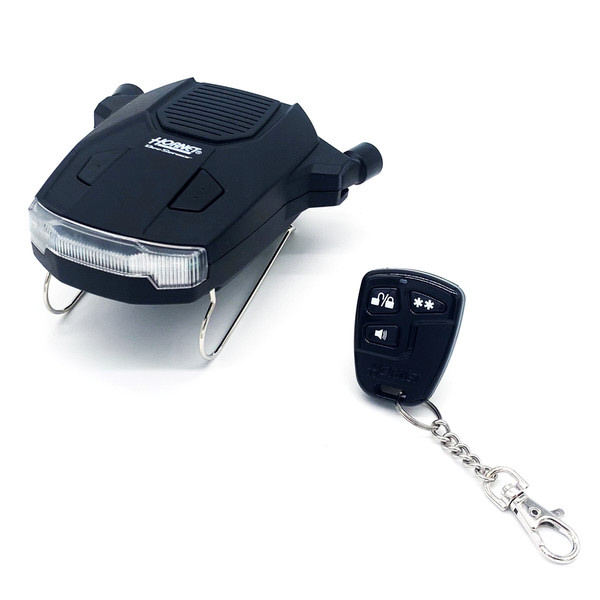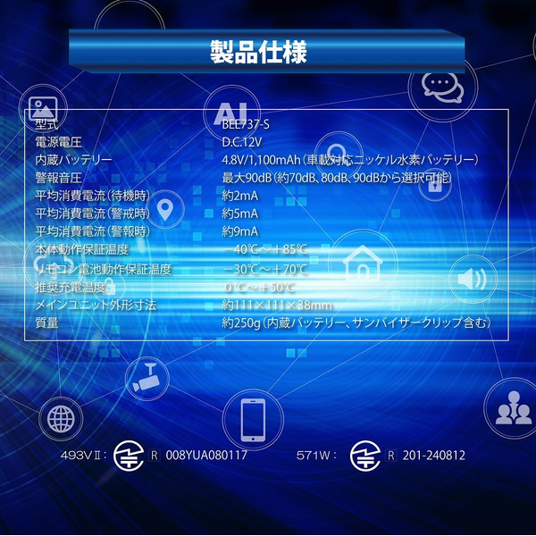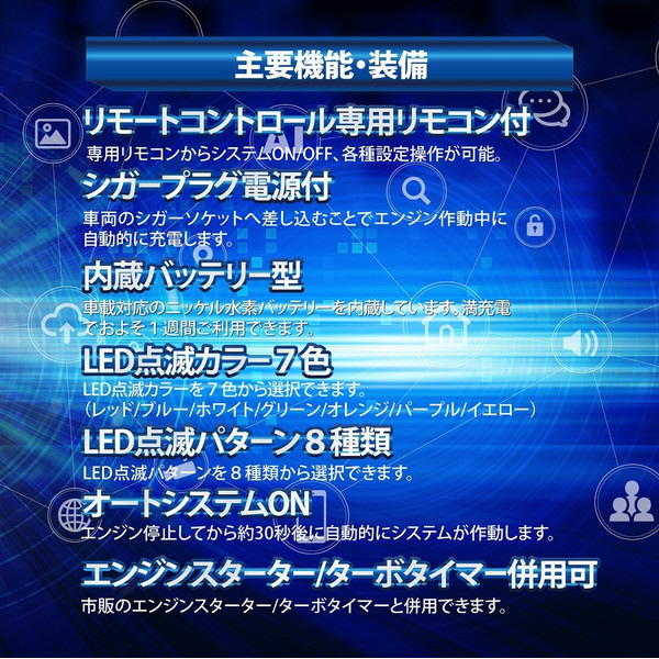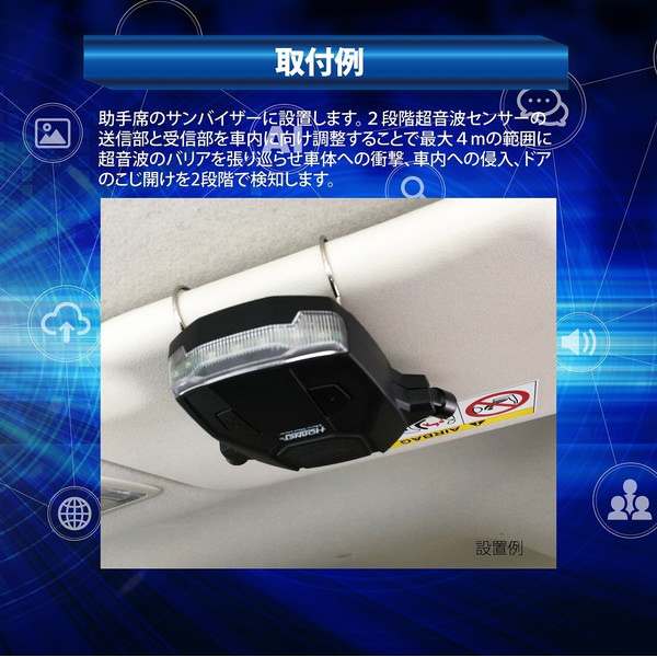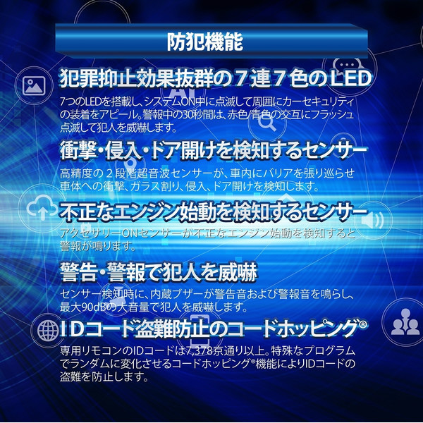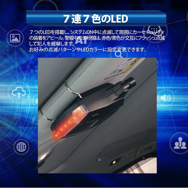 衝撃、振動、侵入、ドア開けを検知できる2段階超音波センサーを搭載し、システムON中は7連LEDが点滅してセキュリティ装着を周囲にアピールできます。