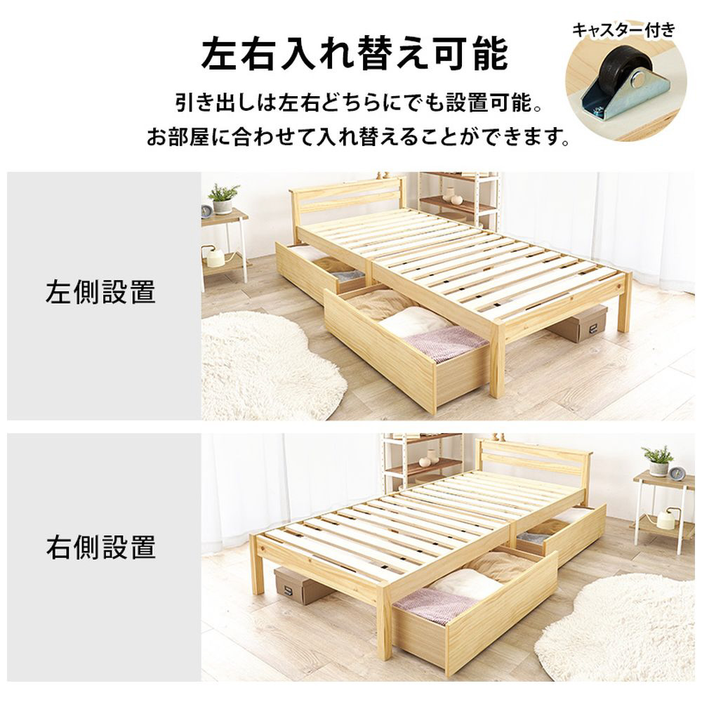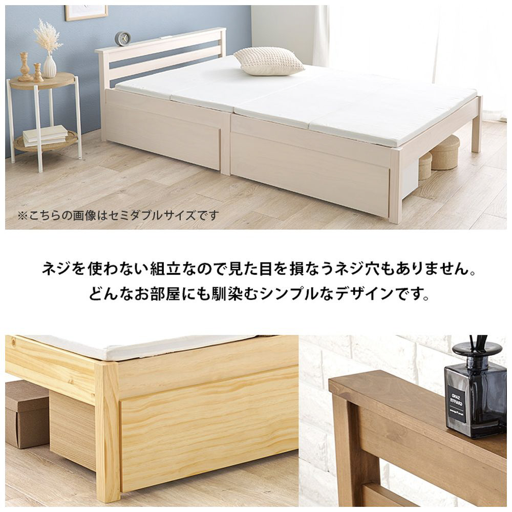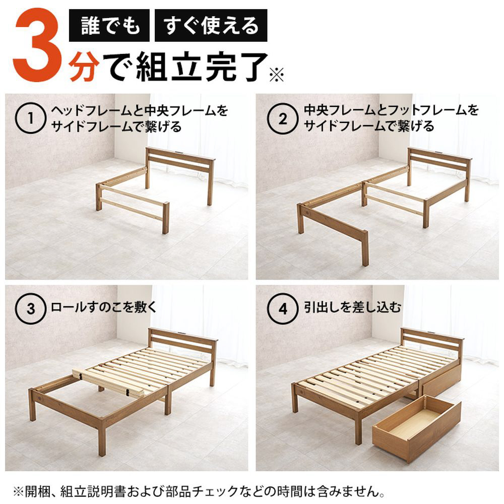 ネジなし、工具不要で簡単組立。模様替えや引っ越しにも便利な宮付きベッドです。大容量収納可能な引出し2杯付き