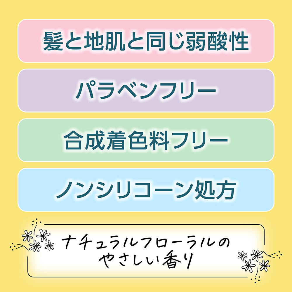 きめ細やかな泡立ち、すこやかな地肌に。●うるおい成分:5つの植物由来エキス(ユーカリ・カモミラ・レンゲソウ・アスナロ・シラカバ)、フルーツ酸(リンゴ酸)配合●髪と地肌と同じ弱酸性●パラベンフリー・合成着色料フリー・ノンシリコーン処方●有効成分 甘草エキス(グリチルリチン酸ジカリウム)●髪と地肌をすこやかに保つ●フケ・かゆみを防ぐ(医薬部外品)