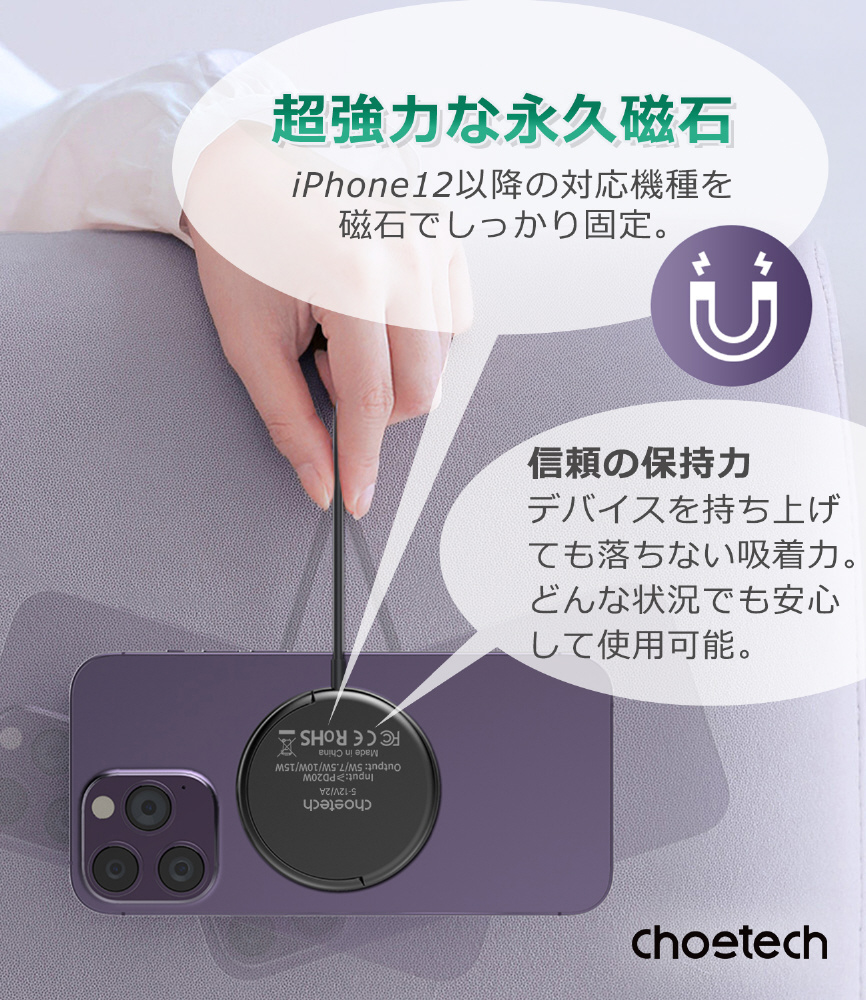 高品質な磁石がデバイスをしっかりと固定するので、ズレる心配はいりません。移動中でも安定した効率的な充電が可能です。