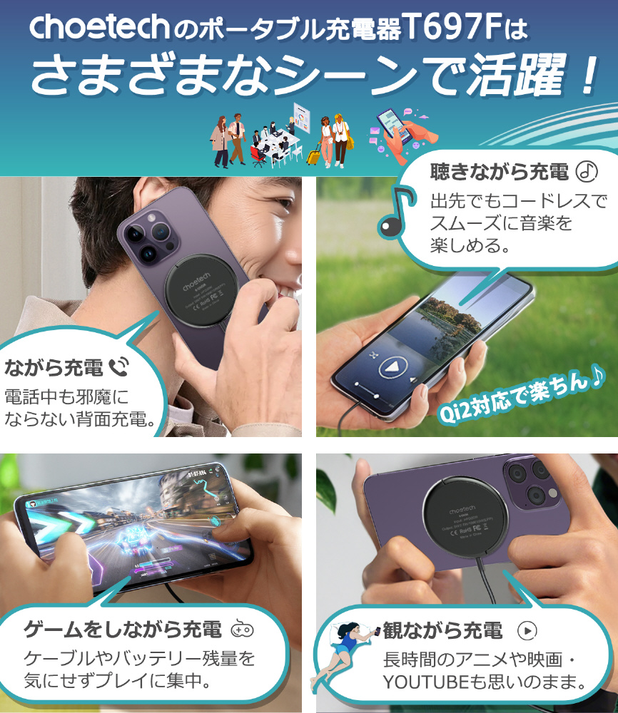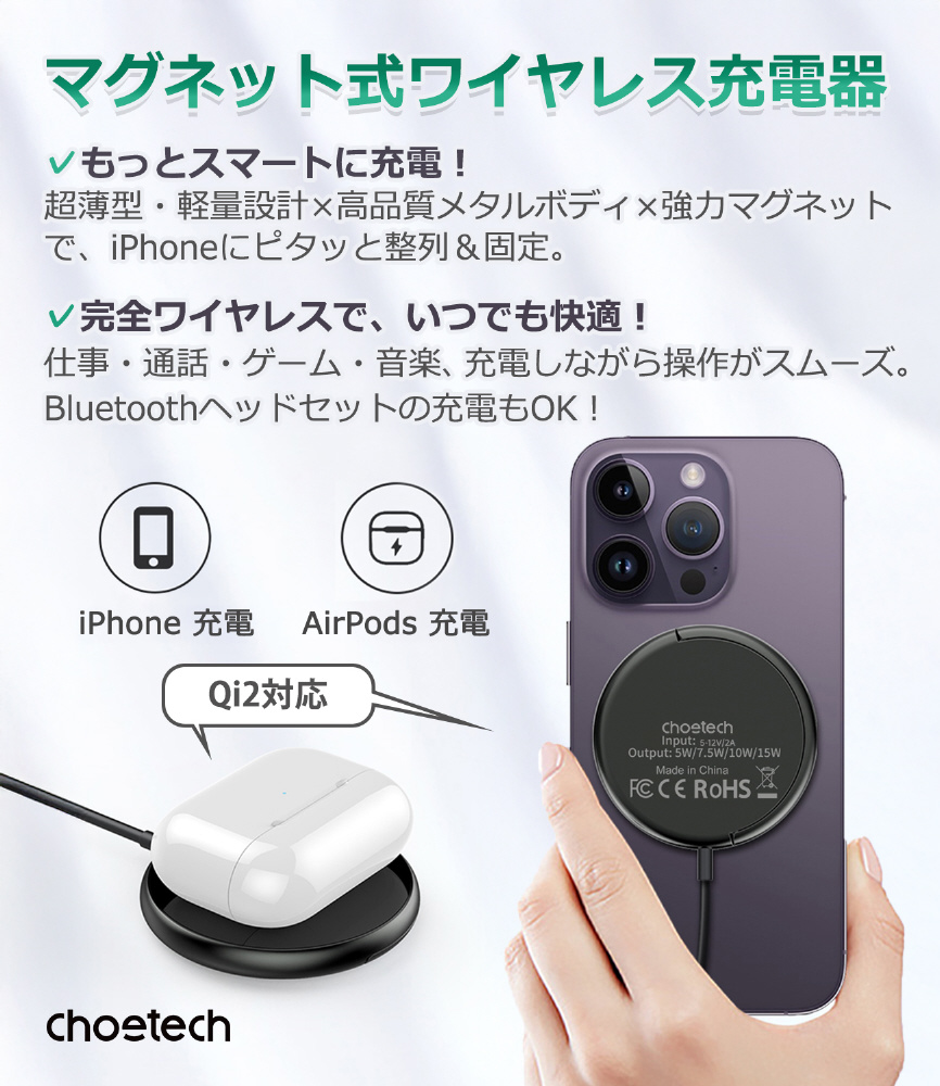 15Wから2.5Wまで幅広く対応し、iPhone・Android・ワイヤレスイヤホンなど、多くのQi2対応デバイスで使用可能。