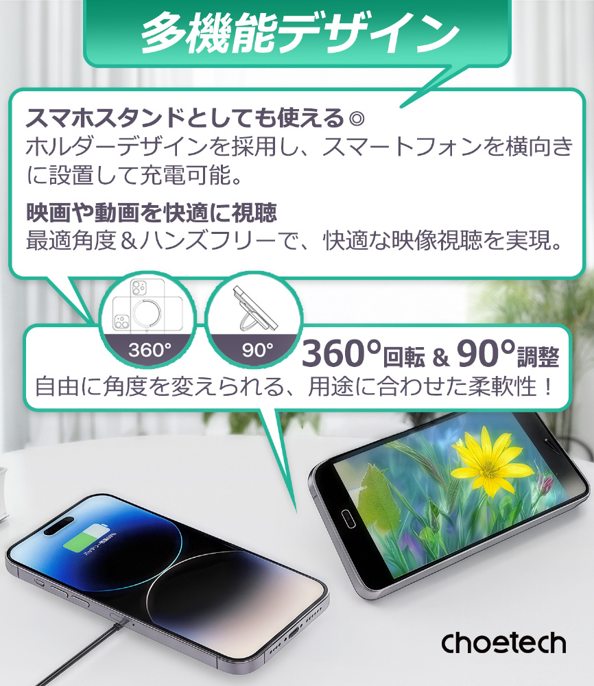 磁吸式スタンドでデバイスを横向きに固定。充電しながらのゲームや、動画視聴を快適に楽しめるように設計されています。