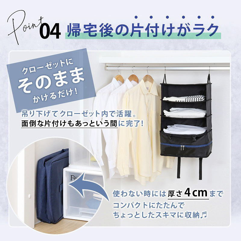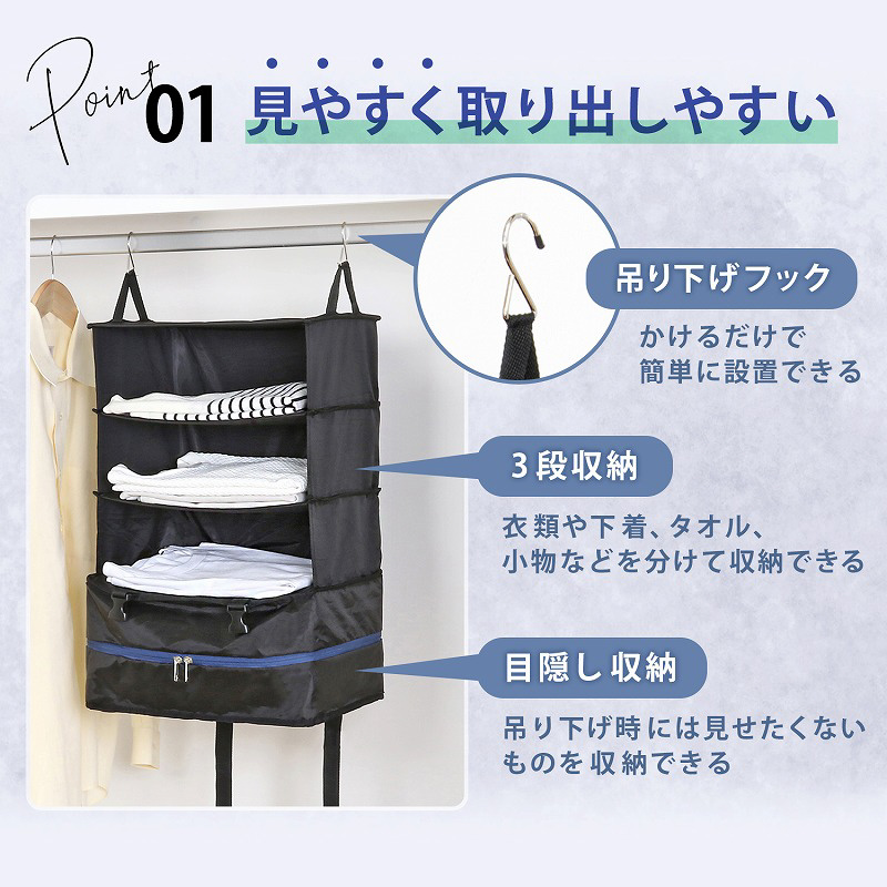 吊り下げると前面オープンのスペース3つ、ファスナー付きの収納スペース1つに大変身。