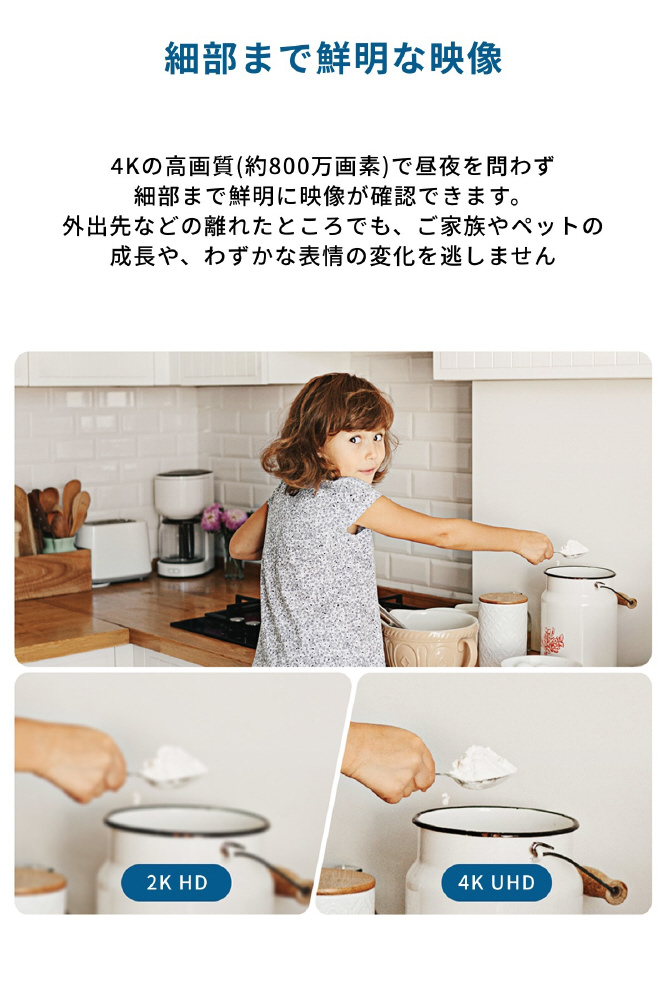 4Kの高画質カメラ(約800万画素)を搭載。昼夜を問わず、細部まで鮮明に映像を確認できます。外出先などの離れたところでも、ご家族やペットの成長や、わずかな表情の変化を逃しません。