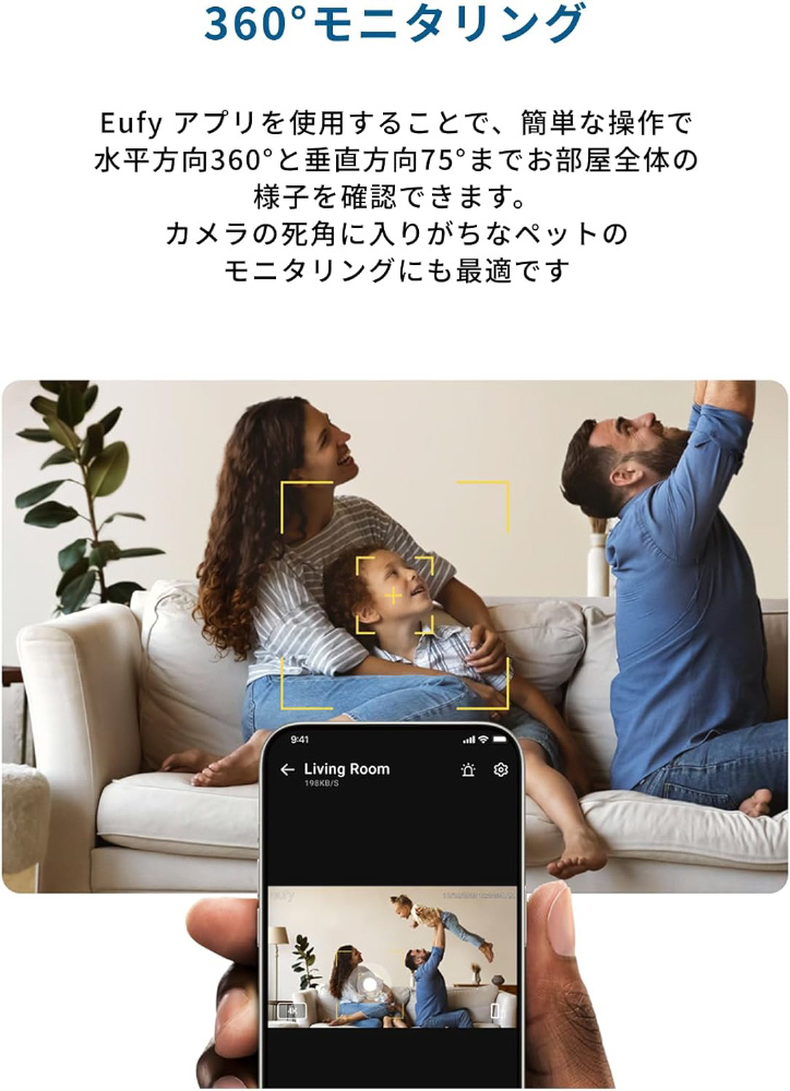 Eufy アプリを使用することで、簡単な操作で水平方向360°と垂直方向75°まで、お部屋全体の様子を確認できます。カメラの死角に入りがちなペットのモニタリングにも最適です。