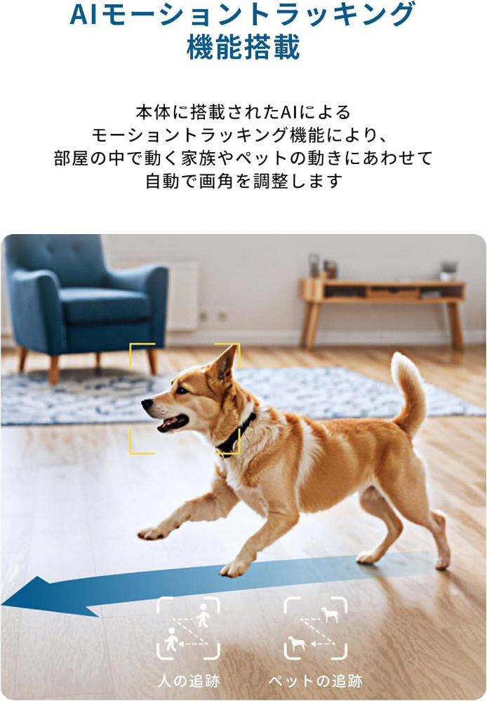 本体に搭載されたAIによるモーショントラッキング機能により、部屋の中で動く家族やペットの動きにあわせて自動で画角を調整します。