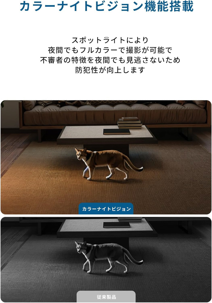 スポットライトにより夜間でもフルカラーで撮影が可能で、不審者の特徴を夜間でも見逃さないため、防犯性が向上します。