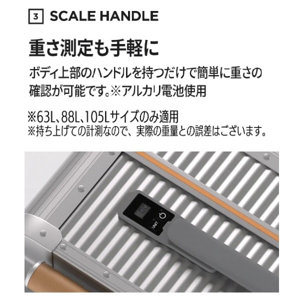 トランクを持ち上げるだけで、どこでも簡単に重量を確認することができます。(63L/88L/105L限定)※実際の重量との誤差はございます。
