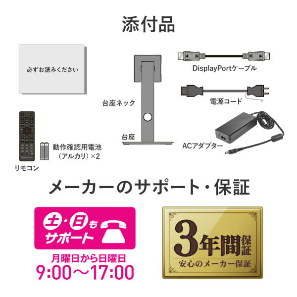 付属品 電源コード(PSE適合品)、DisplayPortケーブル、ACアダプター、台座ネック、台座、リモコン、動作確認用電池(アルカリ)×2、必ずお読みください