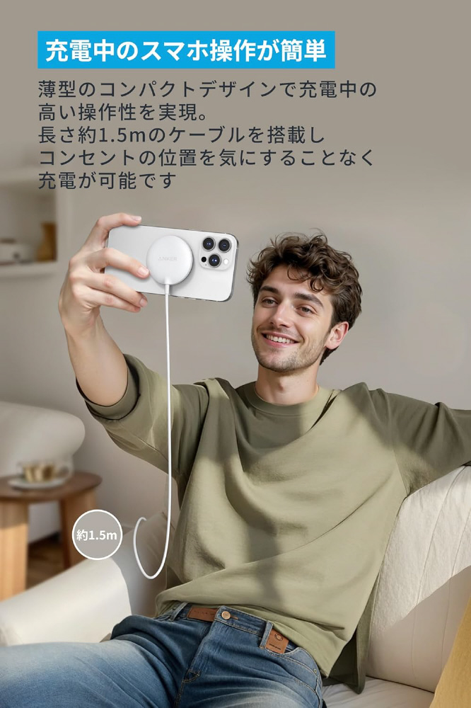 薄型のコンパクトデザインで充電中の高い操作性を実現、長さ約1.5mのケーブルを搭載しコンセントの位置を気にすることなく充電が可能です。