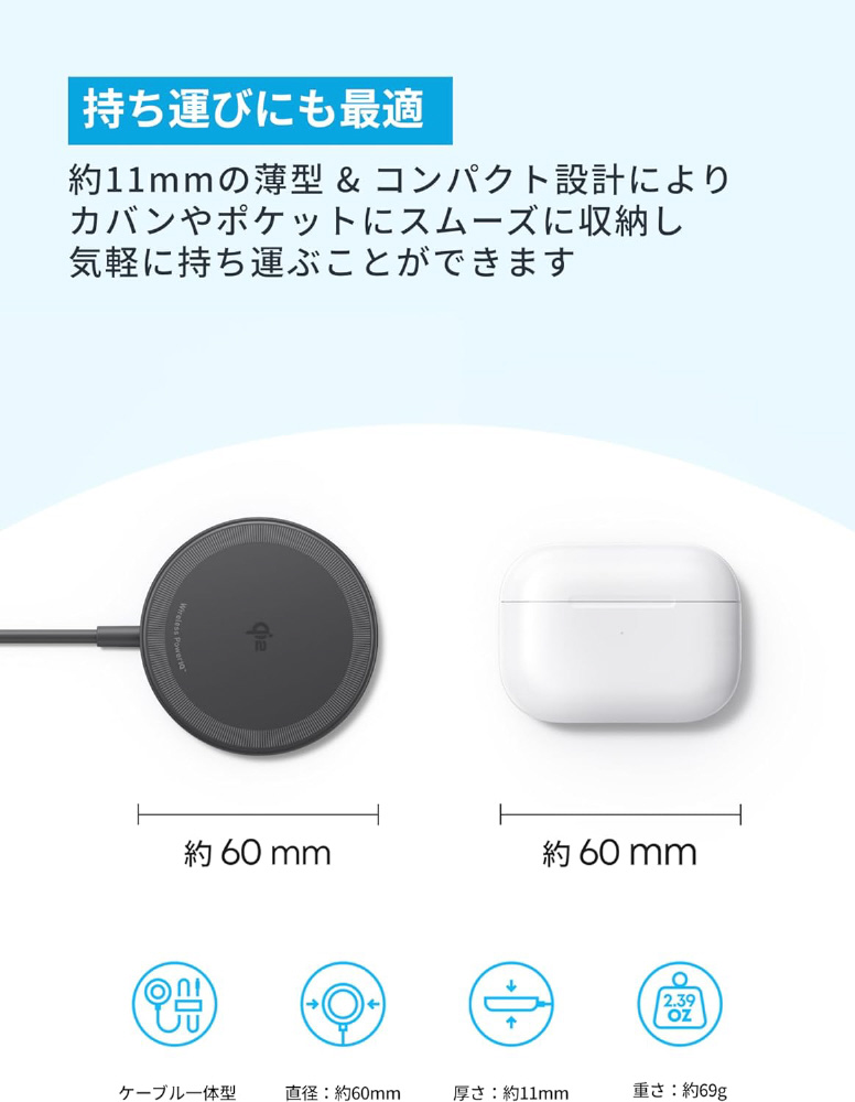 サイズ:約 60 × 60 × 11 mm、重さ:約 69 g、入力:9V?2.5A、出力:マグネット式ワイヤレス充電:MAX 15W、イヤホン用ワイヤレス充電:MAX 5W