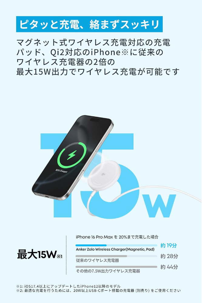 マグネット式ワイヤレス充電対応の充電パッド、Qi2対応のiPhone※に従来のワイヤレス充電器の2倍の最大15W出力でワイヤレス充電が可能です。(※: iOS17.4以上にアップデートしたiPhone12以降のモデル)