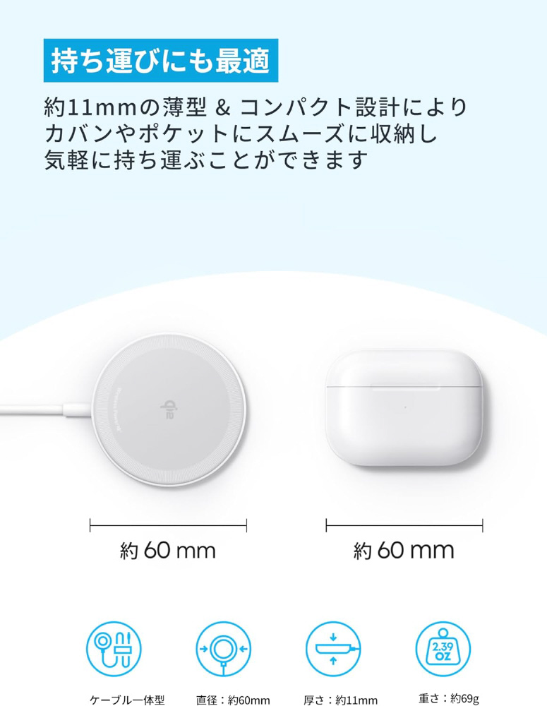 サイズ:約 60 × 60 × 11 mm、重さ:約 69 g、入力:9V?2.5A、出力:マグネット式ワイヤレス充電:MAX 15W、イヤホン用ワイヤレス充電:MAX 5W