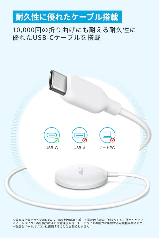 10,000回の折り曲げにも耐える耐久性に優れたUSB-Cケーブルを搭載。