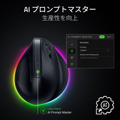 ワンクリックでテキストの要約やメールの下書き作成などが可能です。Razer Synapse 4 経由で強力なショートカットを有効にし、マウスに保存して、AI ツールのワークフローを即座に効率化できます。