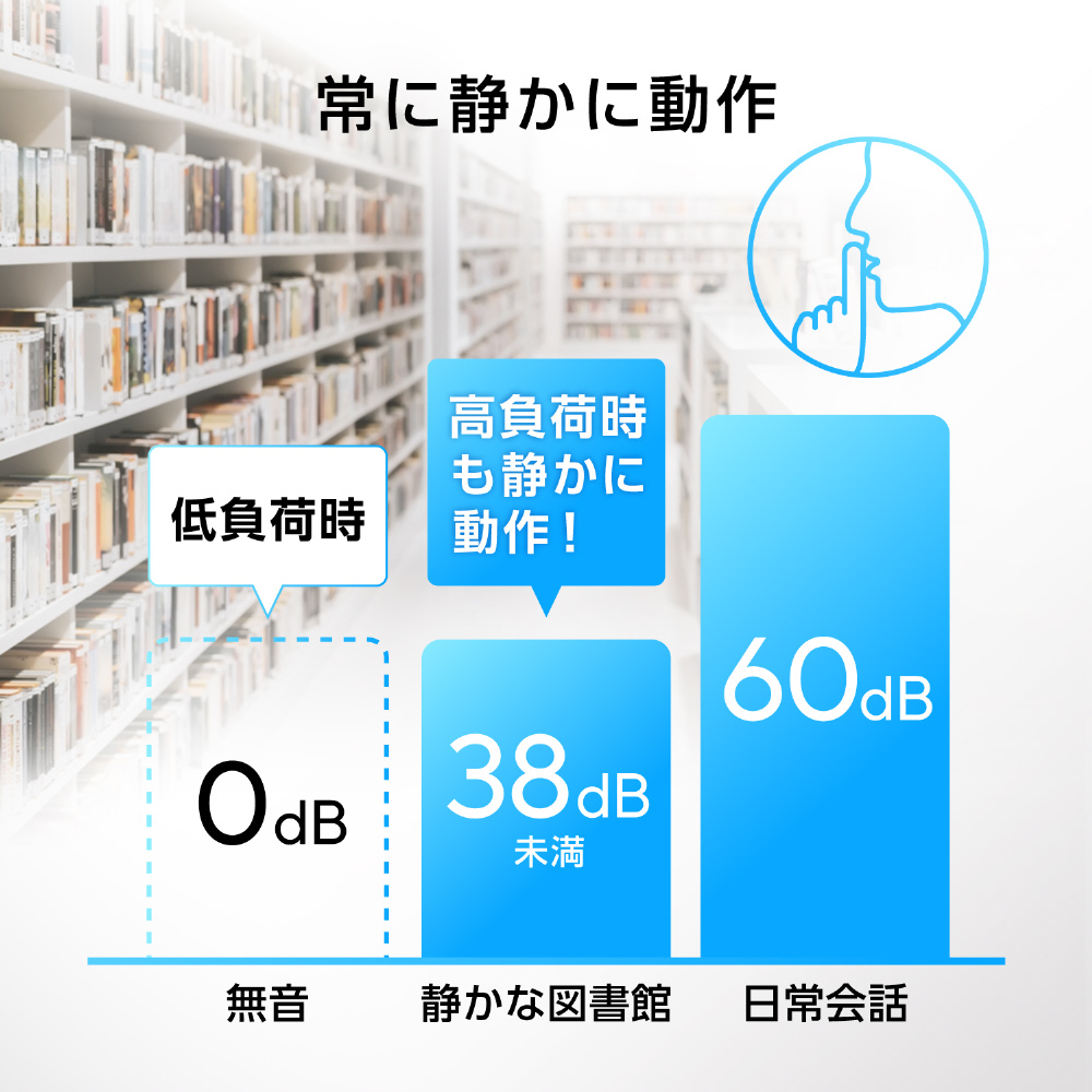 ASUS V500 Mini Tower (V500MV)は、ほぼ無音での動作も可能な設計になっています。動作音は高負荷時でも38dB未満に抑えられており、低負荷時にいたってはファンの自動停止技術によって0dBでの動作を可能にしました。これにより、録音やライブ配信を行うような用途でも冷却ファンの音が気になることはなく、より集中して作業を行うことができます。