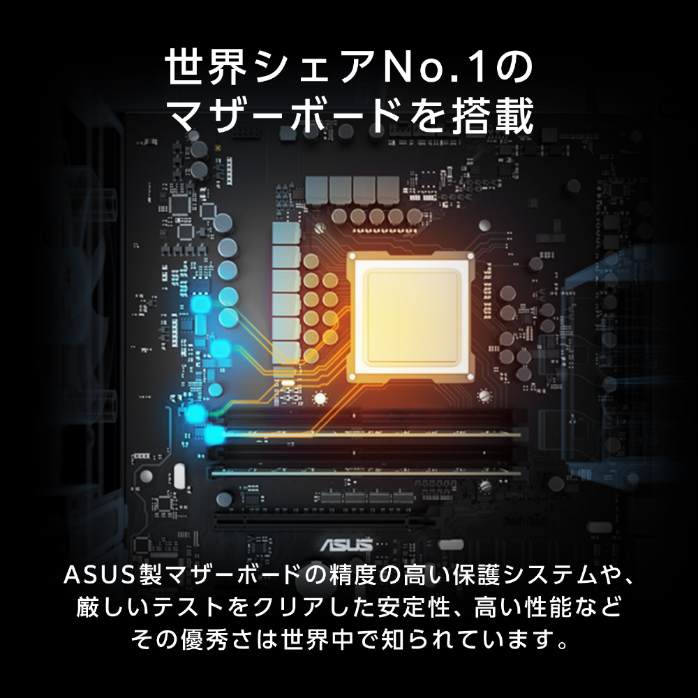 ASUSは世界シェアNo.1のマザーボードブランドです。ASUSのマザーボードの、ハードウェアをしっかりと守る保護システムや、広範囲に渡る厳しいテストで実現した24時間365日の使用に耐えられる安定性、どんなときにも期待を裏切らない高い性能など、その優秀さは世界中で知られています。