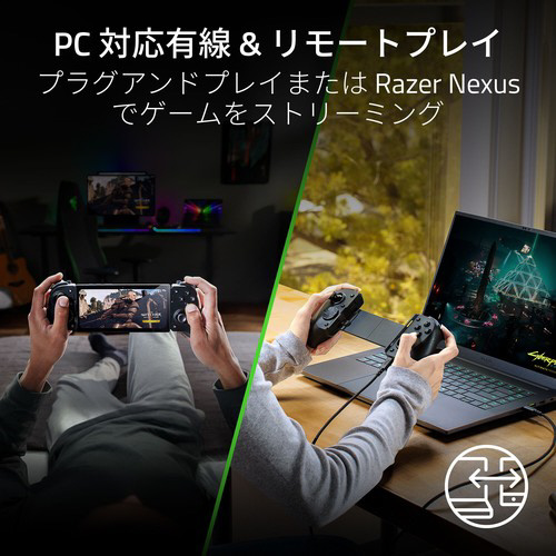 低レイテンシーの USB C 直接接続 (ケーブル別売) で、ハプティック PC コントローラーに変身。Razer Nexus を使えば、どのランチャーからでも PC ゲームをリモートプレイでき、どこでも AAA ゲームを楽しめます。