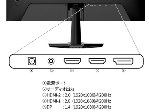 ■インターフェイスはHDMI 2.0 x2 (200Hz)、DisplayPort 1.4 x1 (200Hz)を装備、ゲーム機やパソコンだけでなく、様々な機器との接続が可能です。PS5とのフルHD:120Hz接続に対応。コンソールゲームでもより高精細に、かつ滑らかなゲーム表示を可能にしました。