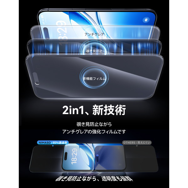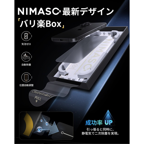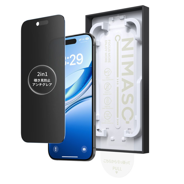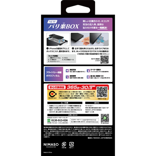 ケースに干渉しないのぞき見防止ガラスフィルム。のぞき見防止加工により左右180度からの視線をブロック、プライバシーを守ります。NIMASO独自のガイドBox「バリ楽」採用。パッケージと一体化した「バリ楽Box」で今まで以上に貼付けがカンタンになりました。フィルムがセットされているバリ楽BoxにiPhoneを被せてシートを引っ張るだけで確実にフィルムを貼付けられます。