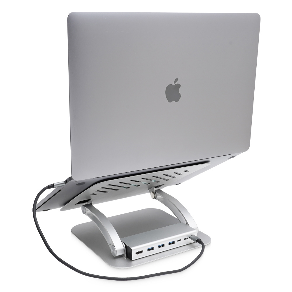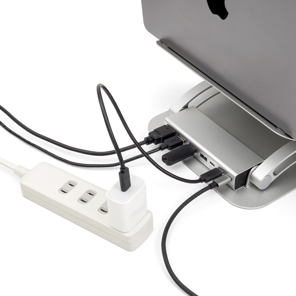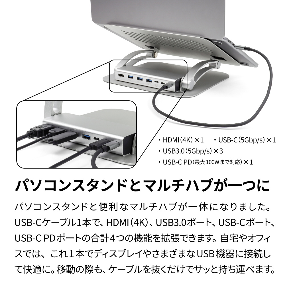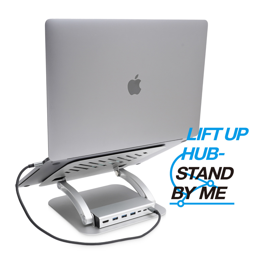 ノートパソコン / タブレットPCスタンド[10〜16インチ]+映像変換アダプタ [USB-C オス→メス HDMI /USB-Ax3+USB-C+USB-Cメス給電 /USB Power Delivery対応 /100W] 4K対応 LIFT UP HUB-STAND BY ME シルバー