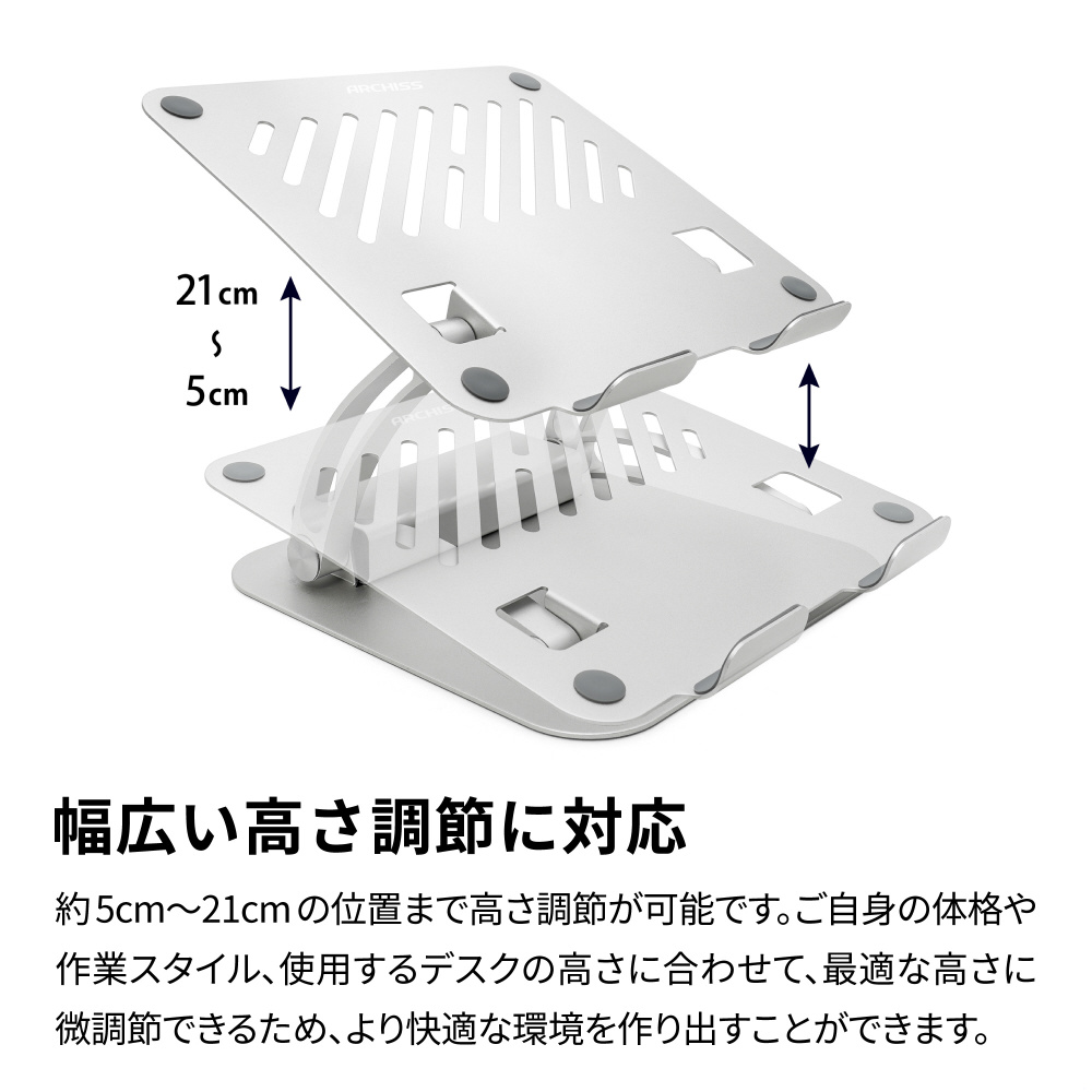 また、外部モニターとつなげて2画面で使う際も、ノートパソコンの高さをモニターの高さに合わせやすく、視線移動が減り作業効率の向上につながります。