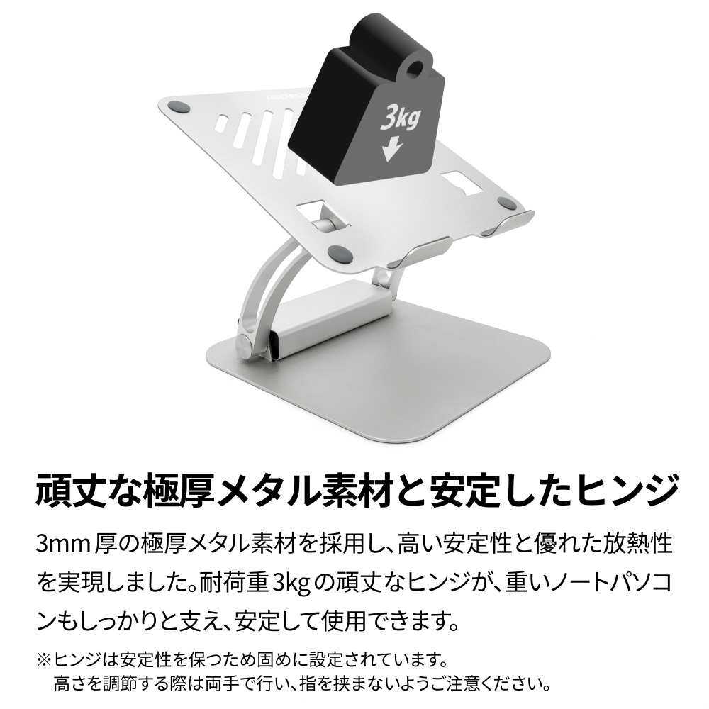 耐荷重3kgの頑丈なヒンジは、重いノートパソコンでもしっかりと支え、安定してご使用いただけます。