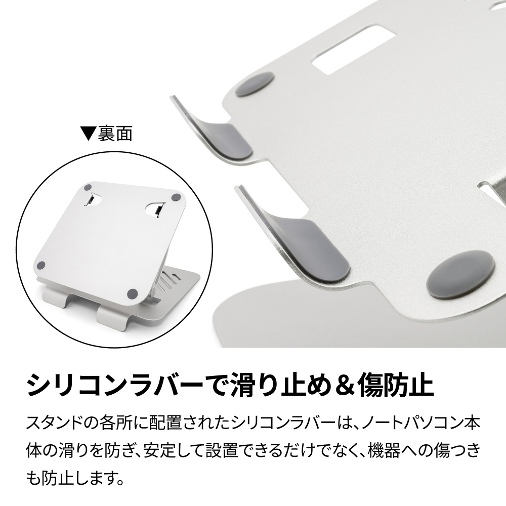 スタンドの各所に配置されたシリコンラバーは、ノートパソコン本体の滑りを防ぎ、安定して設置できるだけでなく、機器への傷つきも防止します。