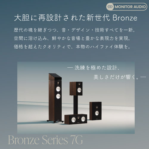 英国Monitor Audioより、新たな時代のエントリー・ハイファイ「Bronze Series 7G」がデビュー。クラスの常識を刷新するその完成度は、洗練された音響技術と現代的なデザイン美の融合から生まれました。音楽と暮らしの心地よい関係を、もう一度見つめなおす。そんな上質なリスニング体験を、誰もが手にできる時代がはじまります。