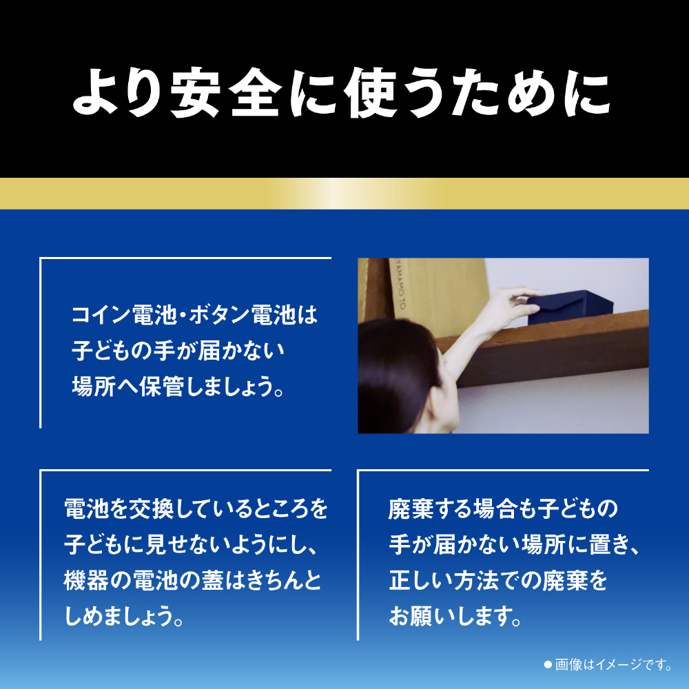 1.誤飲対策をさらに強化。電池本体に苦味成分を塗布。現状の誤飲対策パッケージに加え、電池本体マイナス面に苦味成分を塗布し乳幼児の誤飲を抑制