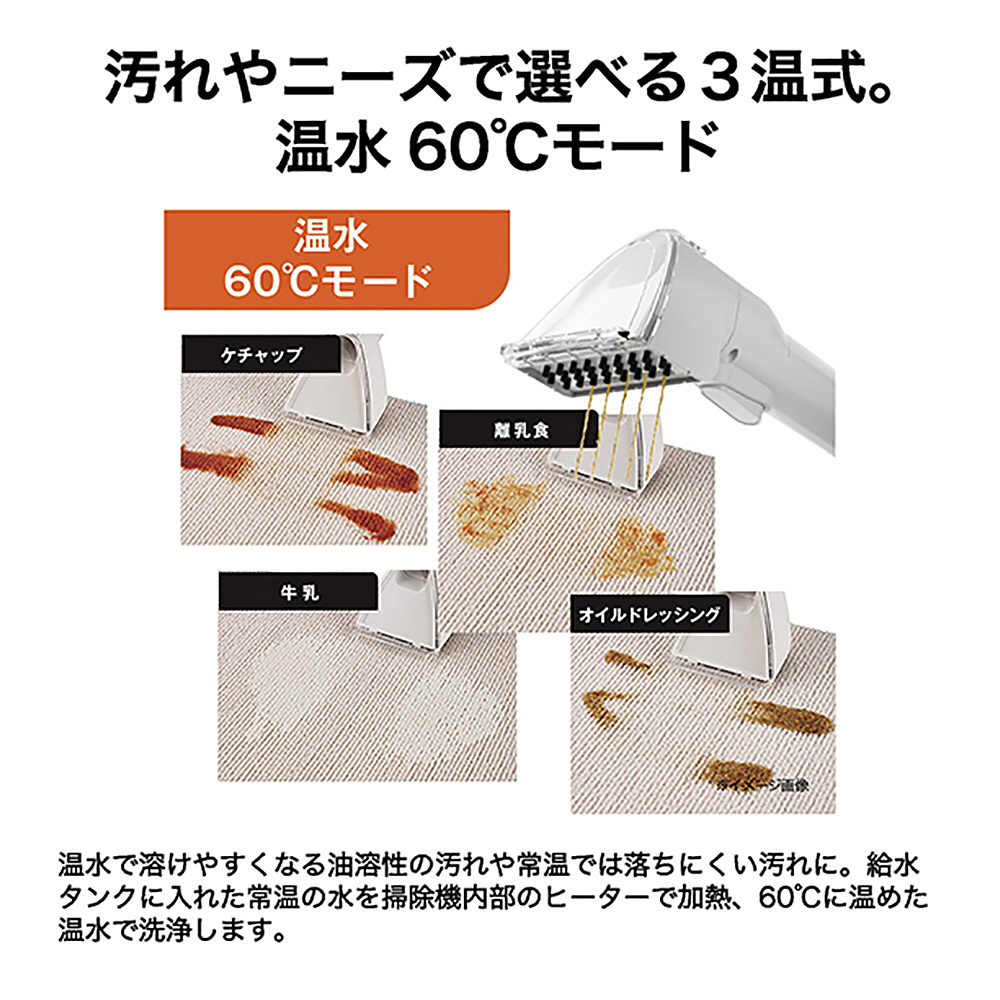 給水タンクに入れた常温の水を掃除機内部のヒーターで加熱、60℃に温めた温水で洗浄します。