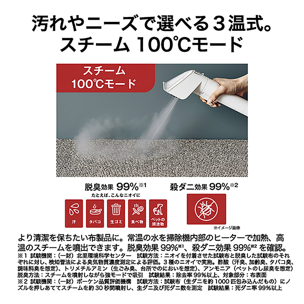より清潔を保ちたい布製品に。常温の水を掃除機内部のヒーターで加熱、高温のスチームを噴出できます。