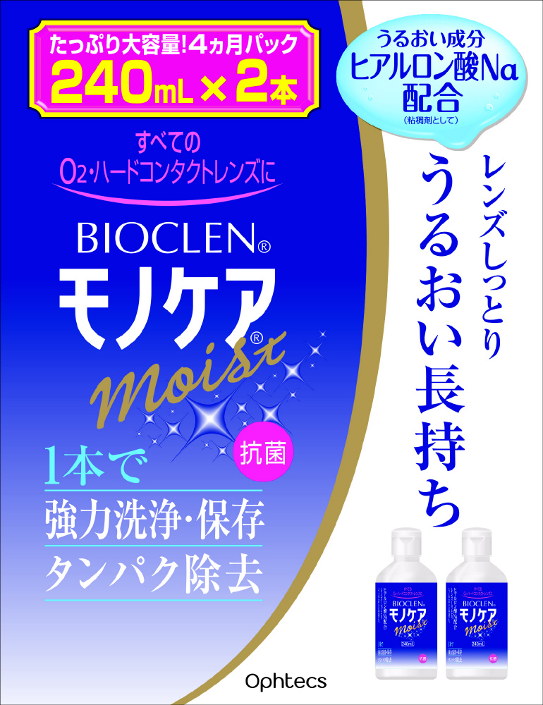 「バイオクレン モノケア モイスト」はO2・ハードレンズ用1本タイプではじめて化粧品の保湿成分にも使われている「ヒアルロン酸ナトリウム」を配合。