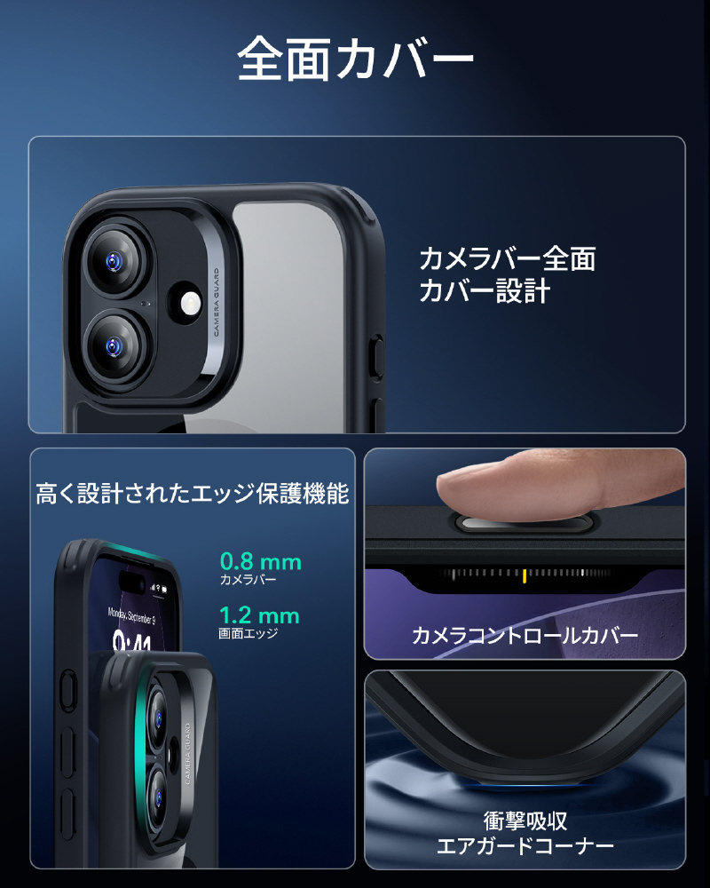 米軍規格MIL-STD-810Hの落下試験に合格したエアガードコーナー(認証番号:GZMR231203686802)を採用します。コンクリートへの高さ3.3メートル落下テストにも耐える設計で、駅のホームでの使用や登山中など、アクティブなシーンでも安心できます。うっかり落とした時も、大切なiPhoneを確実にプロテクトします