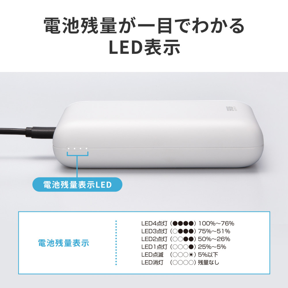 USB Power Delivery(USB PD)規格による最大20Wの出力に対応した、容量20000mAhのモバイルバッテリー。