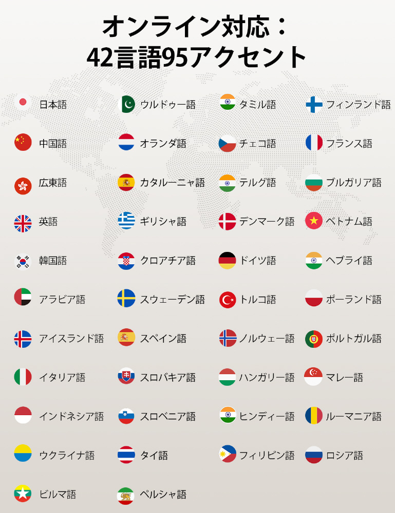 骨伝導センサーによる98%の高精度認識 わずか0.2秒で瞬時に翻訳 AIによる自動補正機能搭載 42言語、95アクセントに対応