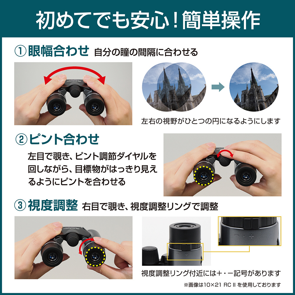 眼幅合わせ、ピント合わせ、視度調整も簡単です。