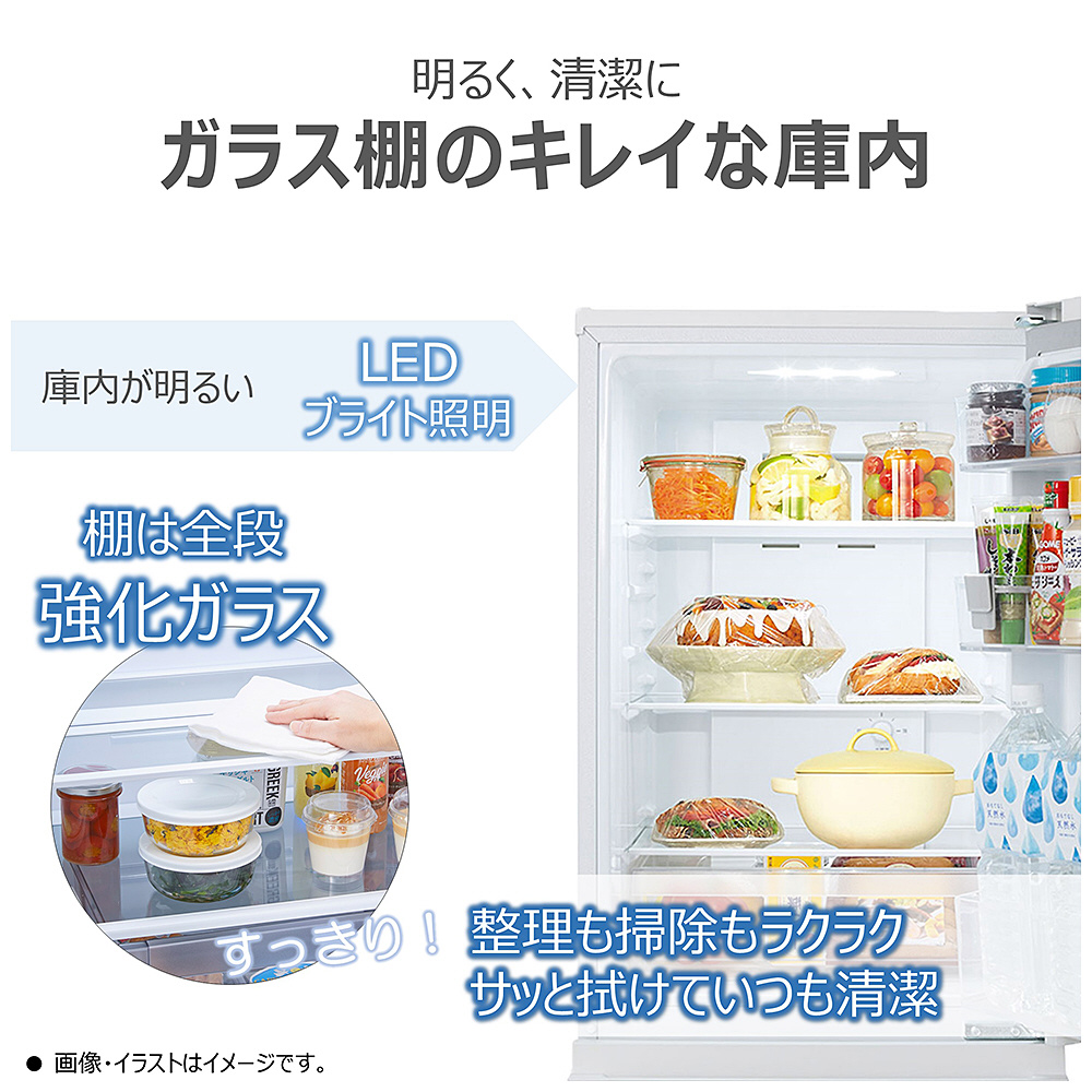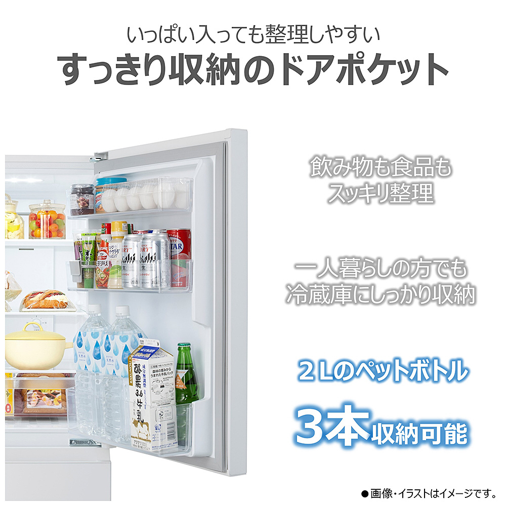 使いやすさにこだわり、シングルライフにぴったりな2ドアタイプ。2Lのペットボトルが3本も入るほか、冷蔵室のガラス棚も3段タイプ。コンパクトなのに使いやすい。
